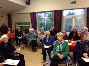 On Tuesday afternoon, 8th November, 2016, Revd Scott McKenna and Sheila Bryer led a poignant Remembrance Service for over 50 people who sat around tables covered in red cloths and decorated with richly-coloured autumn leaves and poppies. Each table displayed a photograph of the various inscribed wood, stone and brass War Memorial plaques on the three walls in the North